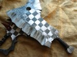 Zupełnie niepraktyczny (bo kto by chciał niszczyć obrazek) puklerz Złego Orkowego Słońca. Dla klimatu wstawiłem drewniane resztki mojego starego puklerza którego używałem przez kilka sezonów. Pomimo, że obrazek słońca jest bardzo nie trwały bo powstał z farb do metalu... to samo umbo ma 2mm grubości i jest produkcji ukraińskiej :) - jest w pełni użytkowe.
